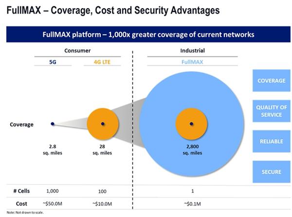FullMAX radios can operate at high transmit power (up to 100 watts) at both the base station and edge remote sites providing fixed and mobile data connectivity up to 30 miles from the tower site. This results in up to 2,800 square miles of coverage from a single FullMAX tower compared with the 28 square miles typically supported by other 4G technologies and three-square miles by 5G technologies. This dramatically reduces the infrastructure cost of building and operating a private Fog network. For example, to cover a territory of over 10,000 square miles may require only four FullMAX towers compared with more than 350 typical 4G towers, depending on the topography of the region.