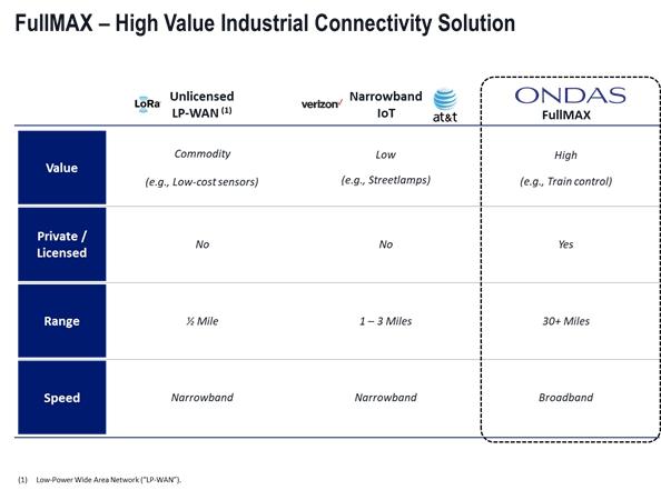 Ondas Networks provides wireless connectivity solutions enabling mission-critical Industrial Internet applications and services. We refer to these applications as the Mission-Critical Internet of Things (“MC-IoT”). The Company’s wireless networking products are applicable to a wide range of MC-IoT applications, which are most often located at the very edge of large industrial networks. These applications require secure, real time connectivity with the ability to process large amounts of data at the edge. Such applications are required in all of the major critical infrastructure markets, including rail, electric grids, drones, oil and gas, and public safety and government, where secure, reliable and fast operational decisions are required in order to improve efficiency and ensure a high degree of safety and security. We design, develop, manufacture, sell and support FullMAX, our patented, Software Defined Radio (“SDR”) platform for secure, licensed, private, wide-area broadband networks. Our customers install FullMAX systems in order to upgrade and expand their legacy wide-area network (“WAN”) infrastructure. Our MC-IoT intellectual property has been adopted by the Institute of Electrical and Electronics Engineers (“IEEE”), the leading worldwide standards body in data networking protocols, and forms the core of the IEEE 802.16s standard. Because standards-based communications solutions are preferred by our mission-critical customers and ecosystem partners, Ondas has taken a leadership position in IEEE as it relates to wireless networking for industrial markets. As such, management believes this standards-based approach supports the adoption of the Company’s technology across a burgeoning ecosystem of partners and end markets.