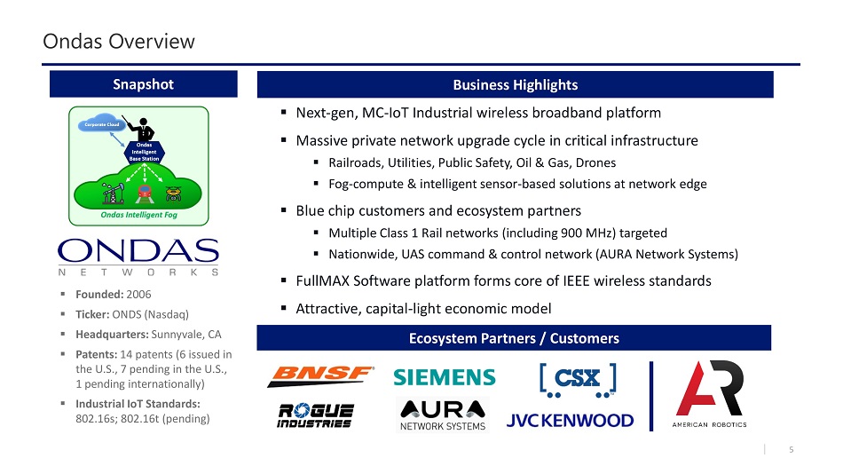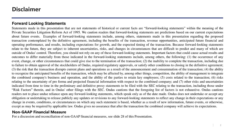 Statements made in this presentation that are not statements of historical or current facts are “forward - looking statements” within the meaning of the Private Securities Litigation Reform Act of 1995 . We caution readers that forward - looking statements are predictions based on our current expectations about future events . Examples of forward - looking statements include, among others, statements made in this presentation regarding the proposed transaction contemplated by the definitive agreement, including the benefits of the transaction, revenue opportunities, anticipated future financial and operating performance, and results, including expectations for growth, and the expected timing of the transaction . Because forward - looking statements relate to the future, they are subject to inherent uncertainties, risks, and changes in circumstances that are difficult to predict and many of which are outside of Ondas' control . Therefore, you should not rely on any of these forward - looking statements . Important factors that could cause actual results and outcomes to differ materially from those indicated in the forward - looking statements include, among others, the following : ( 1 ) the occurrence of any event, change, or other circumstances that could give rise to the termination of the transaction ; ( 2 ) the inability to complete the transaction, including due to failure to obtain approval of the stockholders of Ondas, required regulatory approvals, or satisfy other conditions to closing in the definitive agreement ; ( 3 ) the risk that the transaction disrupts current plans and operations as a result of the announcement and consummation of the transaction ; ( 4 ) the ability to recognize the anticipated benefits of the transaction, which may be affected by, among other things, competition, the ability of management to integrate the combined company's business and operation, and the ability of the parties to retain key employees ; ( 5 ) costs related to the transaction ; ( 6 ) risks relating to the uncertainty of pro forma and projected financial information with respect to the combined company ; and ( 7 ) other risks and uncertainties indicated from time to time in the preliminary and definitive proxy statements to be filed with the SEC relating to the transaction, including those under “Risk Factors” therein, and in Ondas' other filings with the SEC . Ondas cautions that the foregoing list of factors is not exhaustive . Ondas cautions readers not to place undue reliance upon any forward - looking statements, which speak only as of the date made . Ondas does not undertake or accept any obligation or undertaking to release publicly any updates or revisions to any forward - looking statements to reflect any change in their expectations or any change in events, conditions, or circumstances on which any such statement is based, whether as a result of new information, future events, or otherwise, except as may be required by applicable law . Ondas gives no assurance that after the transaction the combined company will achieve its expectations . Disclaimer 2 Forward Looking Statements Non - GAAP Financial Measure For a discussion and reconciliation of non - GAAP financial measures, see slide 28 of this Presentation.
