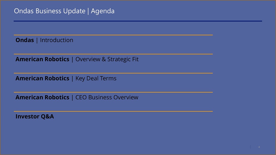 Ondas Business Update | Agenda 4 Ondas | Introduction American Robotics | Overview & Strategic Fit American Robotics | Key Deal Terms American Robotics | CEO Business Overview Investor Q&A