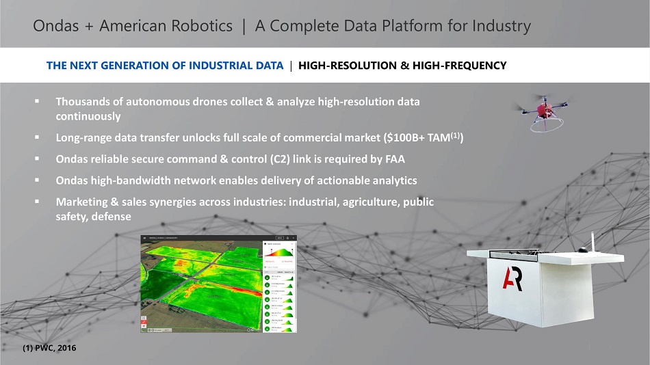 Ondas + American Robotics | A Complete Data Platform for Industry 8 ▪ Thousands of autonomous drones collect & analyze high - resolution data continuously ▪ Long - range data transfer unlocks full scale of commercial market ($100B+ TAM (1) ) ▪ Ondas reliable secure command & control (C2) link is required by FAA ▪ Ondas high - bandwidth network enables delivery of actionable analytics ▪ Marketing & sales synergies across industries: industrial, agriculture, public safety, defense THE NEXT GENERATION OF INDUSTRIAL DATA | HIGH - RESOLUTION & HIGH - FREQUENCY (1) PWC, 2016