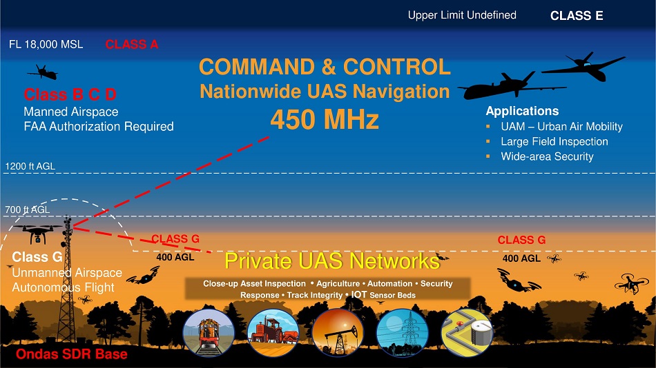 Private UAS Networks Upper Limit Undefined FL 18,000 MSL CLASS E CLASS A Class B C D Manned Airspace FAA Authorization Required COMMAND & CONTROL Nationwide UAS Navigation 450 MHz Applications ▪ UAM – Urban Air Mobility ▪ Large Field Inspection ▪ Wide - area Security CLASS G 400 AGL Class G Unmanned Airspace Autonomous Flight 700 ft AGL 1200 ft AGL Close - up Asset Inspection • Agriculture • Automation • Security Response • Track Integrity • IOT Sensor Beds Ondas SDR Base CLASS G 400 AGL