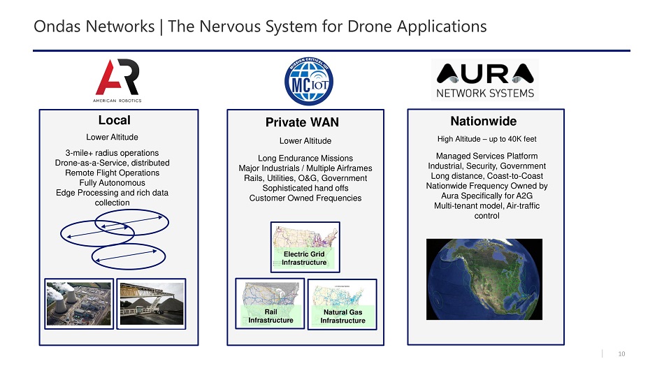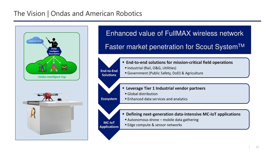 Ondas Networks | The Nervous System for Drone Applications 10 Local Nationwide Lower Altitude 3 - mile+ radius operations Drone - as - a - Service, distributed Remote Flight Operations Fully Autonomous Edge Processing and rich data collection Lower Altitude Long Endurance Missions Major Industrials / Multiple Airframes Rails, Utilities, O&G, Government Sophisticated hand offs Customer Owned Frequencies High Altitude – up to 40K feet Managed Services Platform Industrial, Security, Government Long distance, Coast - to - Coast Nationwide Frequency Owned by Aura Specifically for A2G Multi - tenant model, Air - traffic control Electric Grid Infrastructure Rail Infrastructure Natural Gas Infrastructure Private WAN