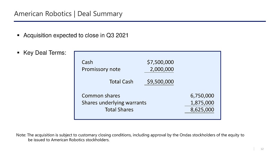 The Vision | Ondas and American Robotics 11 Enhanced value of FullMAX wireless network Faster market penetration for Scout System TM End - to - End Solutions ▪ End - to - end solutions for mission - critical field operations ▪ Industrial (Rail, O&G, Utilities) ▪ Government (Public Safety, DoD) & Agriculture Ecosystem ▪ Leverage Tier 1 Industrial vendor partners ▪ Global distribution ▪ Enhanced data services and analytics MC - IoT Applications ▪ Defining next - generation data - intensive MC - IoT applications ▪ Autonomous drone – mobile data gathering ▪ Edge compute & sensor networks