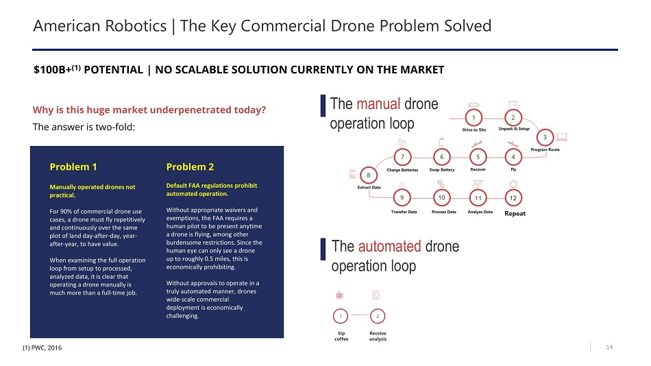 American Robotics | The Key Commercial Drone Problem Solved 14 Why is this huge market underpenetrated today? The answer is two - fold: $100B+ (1) POTENTIAL | NO SCALABLE SOLUTION CURRENTLY ON THE MARKET Manually operated drones not practical. For 90% of commercial drone use cases, a drone must fly repetitively and continuously over the same plot of land day - after - day, year - after - year, to have value. When examining the full operation loop from setup to processed, analyzed data, it is clear that operating a drone manually is much more than a full - time job. Problem 1 Default FAA regulations prohibit automated operation. Without appropriate waivers and exemptions, the FAA requires a human pilot to be present anytime a drone is flying, among other burdensome restrictions. Since the human eye can only see a drone up to roughly 0.5 miles, this is economically prohibiting. Without approvals to operate in a truly automated manner, drones wide - scale commercial deployment is economically challenging. Problem 2 The manual drone operation loop The automated drone operation loop 1 Sip coffee 2 Receive analysis (1) PWC, 2016