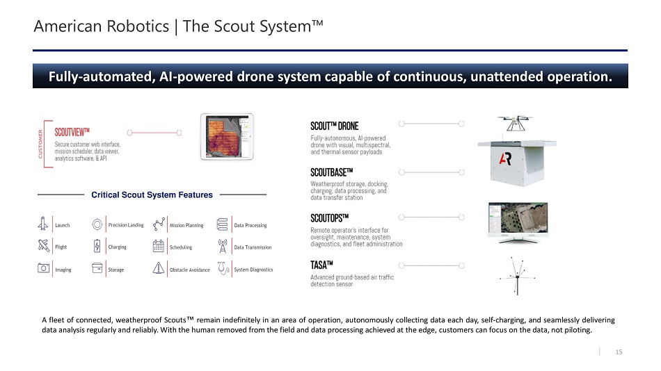 American Robotics | The Scout System 15 Fully - automated, AI - powered drone system capable of continuous, unattended operation. Critical Scout System Features A fleet of connected, weatherproof Scouts remain indefinitely in an area of operation, autonomously collecting data each day, self - charging, and seamlessly delivering data analysis regularly and reliably . With the human removed from the field and data processing achieved at the edge, customers can focus on the data, not piloting .