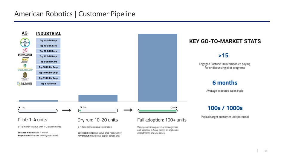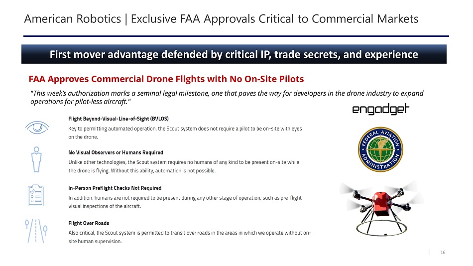 American Robotics | Exclusive FAA Approvals Critical to Commercial Markets 16 First mover advantage defended by critical IP, trade secrets, and experience "This week’s authorization marks a seminal legal milestone, one that paves the way for developers in the drone industry to ex pan d operations for pilot - less aircraft." FAA Approves Commercial Drone Flights with No On - Site Pilots