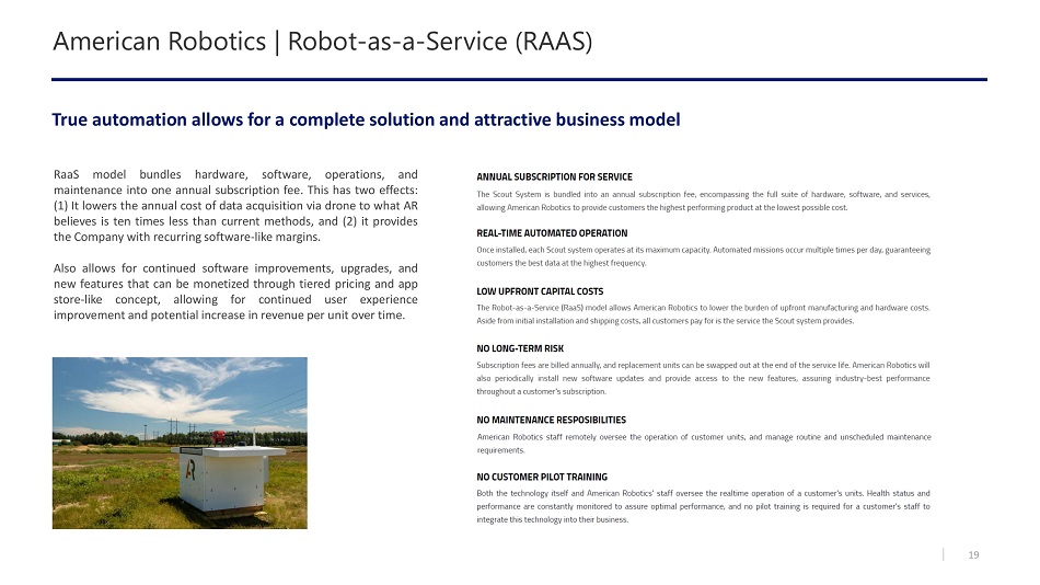 American Robotics | Robot - as - a - Service (RAAS) 19 RaaS model bundles hardware, software, operations, and maintenance into one annual subscription fee . This has two effects : ( 1 ) It lowers the annual cost of data acquisition via drone to what AR believes is ten times less than current methods, and ( 2 ) it provides the Company with recurring software - like margins . Also allows for continued software improvements, upgrades, and new features that can be monetized through tiered pricing and app store - like concept, allowing for continued user experience improvement and potential increase in revenue per unit over time . True automation allows for a complete solution and attractive business model