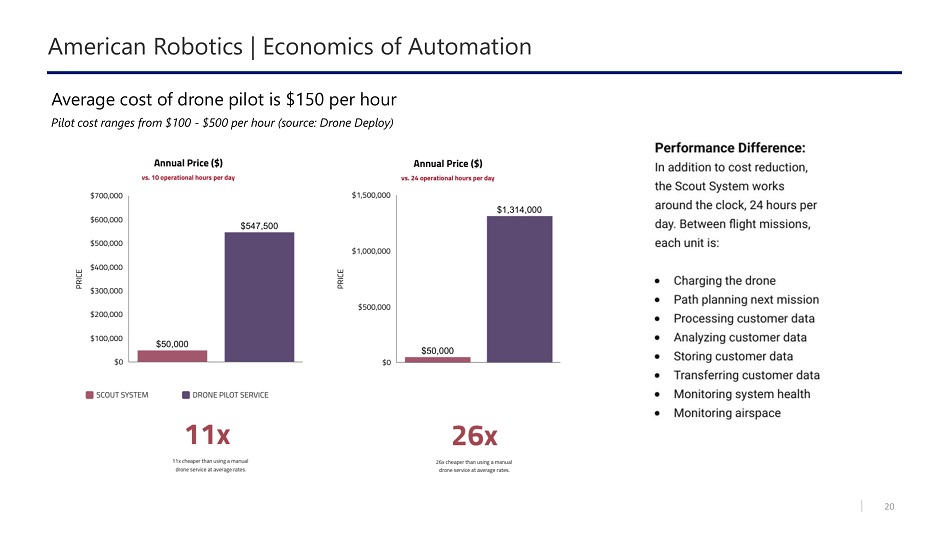 American Robotics | Economics of Automation 20 Average cost of drone pilot is $150 per hour Pilot cost ranges from $100 - $500 per hour (source: Drone Deploy)