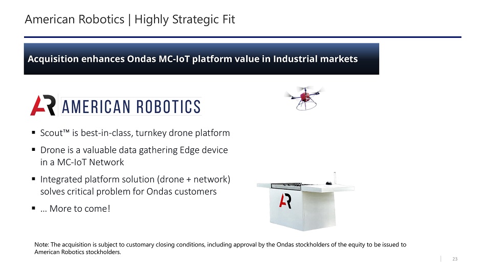 American Robotics | Highly Strategic Fit 23 Acquisition enhances Ondas MC - IoT platform value in Industrial markets ▪ Scout Ρ is best - in - class, turnkey drone platform ▪ Drone is a valuable data gathering Edge device in a MC - IoT Network ▪ Integrated platform solution (drone + network) solves critical problem for Ondas customers ▪ … More to come! Note: The acquisition is subject to customary closing conditions, including approval by the Ondas stockholders of the equity to be issued to American Robotics stockholders.