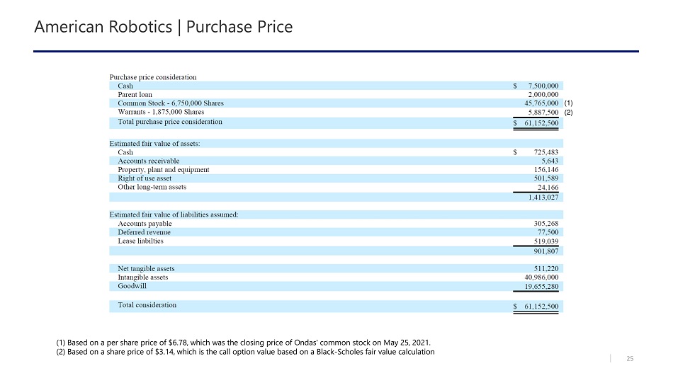 25 American Robotics | Purchase Price (1) Based on a per share price of $6.78, which was the closing price of Ondas' common stock on May 25, 2021. (2) Based on a share price of $3.14, which is the call option value based on a Black - Scholes fair value calculation (1) (2)
