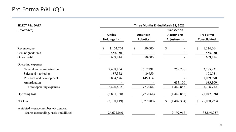 26 Pro Forma Balance Sheet (Q1) SELECT BALANCE SHEET DATA: (Unaudited) Transaction Ondas American Accounting Pro Forma Holdings Inc. Robotics Adjustments Consolidated Current Assets: Cash and cash equivalents $ 24,026,187 $ 725,483 $ (9,500,000) $ 15,251,670 Total current assets 26,201,142 731,126 (9,500,000) 17,432,268 Intangible assets, net 332,603 - 40,986,000 41,318,603 Goodwill - - 19,655,280 19,655,280 Total other assets 551,138 525,755 60,641,280 61,718,173 Total assets $ 26,948,503 $ 1,413,027 $ 51,141,280 $ 79,502,810 Current Liabilities: Secured promissory note 7,064,364 - - 7,064,364 Total current liabilities 11,340,993 768,781 1,787,001 13,896,775 Long-Term Liabilities: Total long-term liabilities 898,577 3,071,025 (2,725,000) 1,244,602 Total liabilities 12,239,570 3,839,806 (937,999) 15,141,377 Stockholders' Equity (Deficit): Common stock - par value $0.0001 2,667 - 732 3,399 Common stock warrants - - 5,887,500 5,887,500 Owners' Equity - (2,426,779) 2,426,779 - Additional paid in capital 83,093,932 - 49,648,643 132,742,575 Accumulated deficit (68,387,666) - (5,884,375) (74,272,041) Total stockholders' equity (deficit) 14,708,933 (2,426,779) 52,079,279 64,361,433 Total liabilities and stockholders' equity (deficit) $ 26,948,503 $ 1,413,027 $ 51,141,280 $ 79,502,810 ASSETS LIABILITIES AND STOCKHOLDERS' DEFICIT As of March 31, 2021