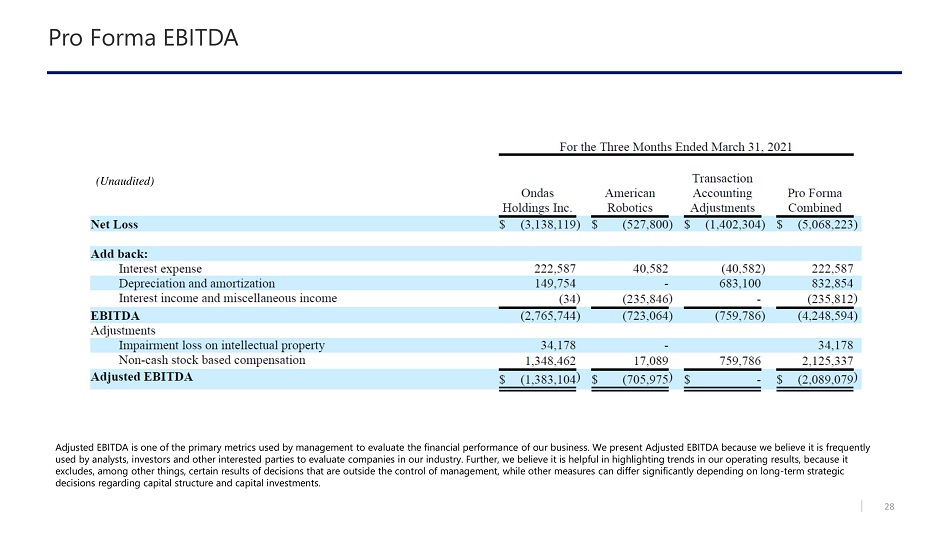 27 Pro Forma P&L (Q1) SELECT P&L DATA (Unaudited) Transaction Ondas American Accounting Pro Forma Holdings Inc. Robotics Adjustments Consolidated Revenues, net $ 1,164,764 50,000$ -$ 1,214,764$ Cost of goods sold 555,350 - - 555,350 Gross profit 609,414 50,000 - 659,414 Operating expenses: General and administration 2,408,854 617,291 759,786 3,785,931 Sales and marketing 187,372 10,659 - 198,031 Research and development 894,576 145,114 - 1,039,690 Amortization - - 683,100 683,100 Total operating expenses 3,490,802 773,064 1,442,886 5,706,752 Operating loss (2,881,388) (723,064) (1,442,886) (5,047,338) Net loss (3,138,119) (527,800) (1,402,304)$ (5,068,223)$ Weighted average number of common shares outstanding, basic and diluted 26,672,040 - 9,197,917 35,869,957 Three Months Ended March 31, 2021