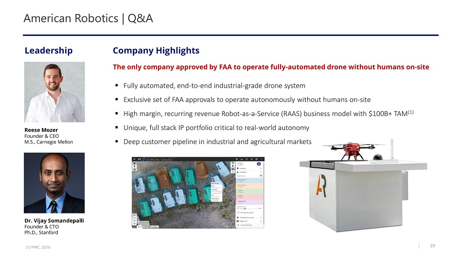 ▪ Fully automated, end - to - end industrial - grade drone system ▪ Exclusive set of FAA approvals to operate autonomously without humans on - site ▪ High margin, recurring revenue Robot - as - a - Service (RAAS) business model with $100B+ TAM (1) ▪ Unique, full stack IP portfolio critical to real - world autonomy ▪ Deep customer pipeline in industrial and agricultural markets Company Highlights Leadership American Robotics | Q&A 29 Reese Mozer Founder & CEO M.S., Carnegie Mellon Dr. Vijay Somandepalli Founder & CTO Ph.D., Stanford (1) PWC, 2016 The only company approved by FAA to operate fully - automated drone without humans on - site