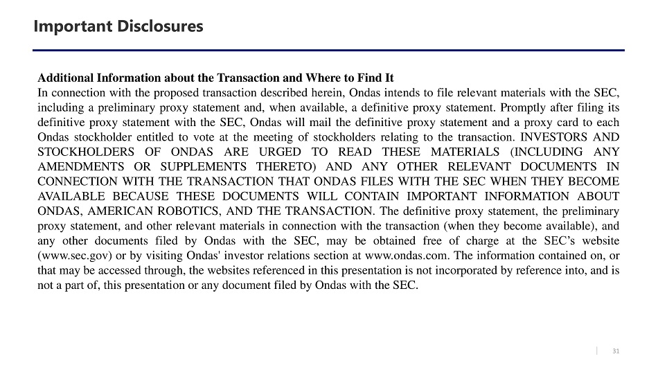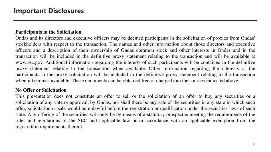 31 Important Disclosures Additional Information about the Transaction and Where to Find It In connection with the proposed transaction described herein, Ondas intends to file relevant materials with the SEC, including a preliminary proxy statement and, when available, a definitive proxy statement . Promptly after filing its definitive proxy statement with the SEC, Ondas will mail the definitive proxy statement and a proxy card to each Ondas stockholder entitled to vote at the meeting of stockholders relating to the transaction . INVESTORS AND STOCKHOLDERS OF ONDAS ARE URGED TO READ THESE MATERIALS (INCLUDING ANY AMENDMENTS OR SUPPLEMENTS THERETO) AND ANY OTHER RELEVANT DOCUMENTS IN CONNECTION WITH THE TRANSACTION THAT ONDAS FILES WITH THE SEC WHEN THEY BECOME AVAILABLE BECAUSE THESE DOCUMENTS WILL CONTAIN IMPORTANT INFORMATION ABOUT ONDAS, AMERICAN ROBOTICS, AND THE TRANSACTION . The definitive proxy statement, the preliminary proxy statement, and other relevant materials in connection with the transaction (when they become available), and any other documents filed by Ondas with the SEC, may be obtained free of charge at the SEC’s website (www . sec . gov) or by visiting Ondas' investor relations section at www . ondas . com . The information contained on, or that may be accessed through, the websites referenced in this presentation is not incorporated by reference into, and is not a part of, this presentation or any document filed by Ondas with the SEC .