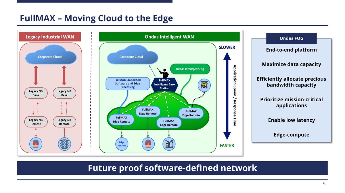 Ondas Networks Overview • Founded: 2006 • T i cke r : O ND S (N a s d a q ) • He a d q u a rters : S u nn y va l e , C A • P a tents : 1 4 pate n ts ( 6 i ss ued in t h e U . S . , 7 p e n d i ng in t h e U . S . , 1 p e n d i ng i n t e r n a t io n a ll y ) • Industrial IoT Standards: 802. 16s ; 802. 1 6 t ( p e n d i n g ) Ecosystem Partners / Customers • Next - gen, MC - IoT Industrial wireless broadband platform • Massive private network upgrade cycle in critical infrastructure • R a i l r o a d s , U t i l i t i es , P u b l i c Sa f ety , O i l & G as , D r on es • Fog - compute & intelligent sensor - based solutions at network edge • B l u e c h ip c u s t o me rs a n d e c o s y s t e m p a r t n e rs • Multiple Class 1 Rail networks (including 900 MHz) targeted • Nationwide, UAS command & control network (AURA Network Systems) • FullMAX Software platform forms core of IEEE wireless standards • Attractive, capital - light financial model with software - like economics Business Highlights Snapshot 5