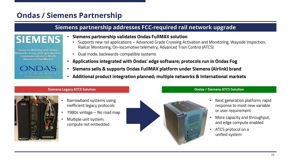Class 1 Freight Rail Required Upgrades 9 Key Class 1 Rail Statistics Adoption of FullMAX by Rail infrastructure Source: Siemens Mobility; Ondas estimates. • Co m m o n n e t w o r k a cr o s s al l 7 Cla s s 1 R a i ls • 140,000 Mi l e s o f T r a c k • 40,000 W a ys i d e s • 65,000 R a i l C r o ss i n g s • 25,000+ locomotives / 1.6 million rail cars • 900 M H z / 160 M H z tota l a d d r e ss a b l e m a r k e t of >$1. 5 b i ll i o n Expect commercial adoption beginning with 900 MHz in 2021