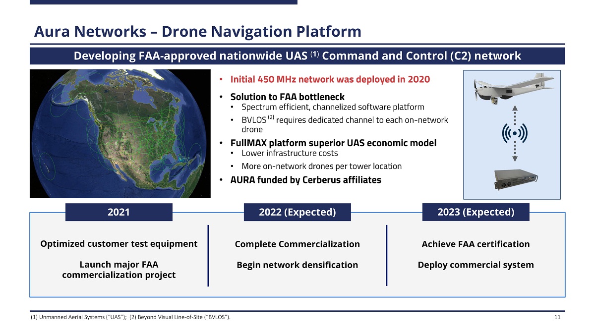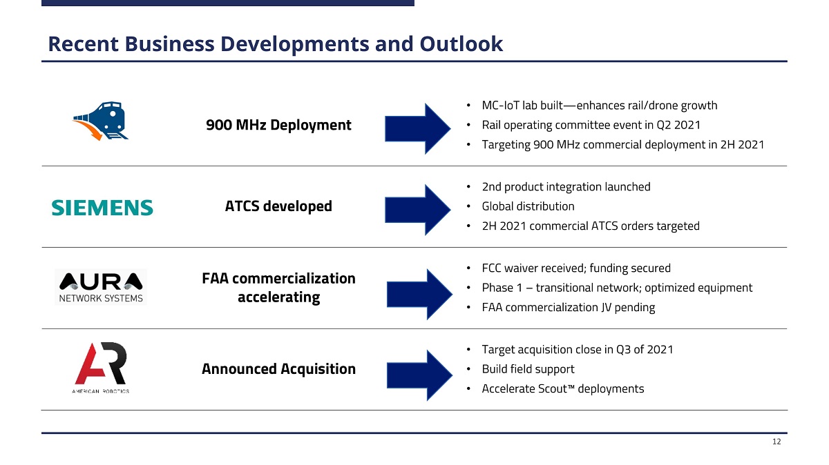A u ra N e t w or k s – D ron e N avi g ati on P l atf orm 11 Developing FAA - approved nationwide UAS ( 1 ) Command and Control (C2) network • Initial 450 MHz network was deployed in 2020 • Solution to FAA bottleneck • Spectrum efficient, channelized software platform • BVLOS (2) requires dedicated channel to each on - network drone • FullMAX platform superior UAS economic model • L o we r i n f ra s t ru ct u re c o s t s • More on - network drones per tower location • AURA funded by Cerberus affiliates Ac h iev e F AA cer ti f i ca t i o n Deploy commercial system 2023 (Expected) 2021 2022 (Expected) Optimized customer test equipment Launch major FAA commercialization project Complete Commercialization Begin network densification (1) Unmanned Aerial Systems (“UAS”); (2) Beyond Visual Line - of - Site (“BVLOS”).