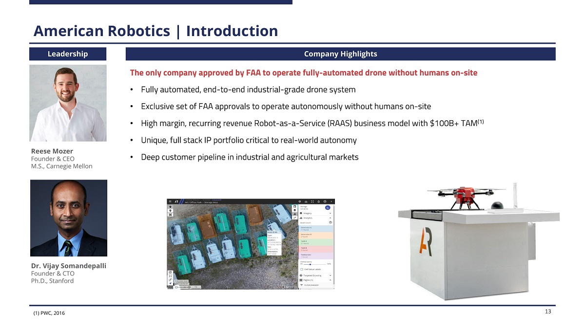 American Robotics | Introduction The only company approved by FAA to operate fully - automated drone without humans on - site • Fully automated, end - to - end industrial - grade drone system • Exclusive set of FAA approvals to operate autonomously without humans on - site • High margin, recurring revenue Robot - as - a - Service (RAAS) business model with $100B+ TAM (1) • Unique, full stack IP portfolio critical to real - world autonomy • Deep customer pipeline in industrial and agricultural markets 13 Leadership Company Highlights Reese Mozer Founder & CEO M.S., Carnegie Mellon Dr. Vijay Somandepalli Founder & CTO P h. D . , S t a n f o r d ( 1 ) P W C , 201 6