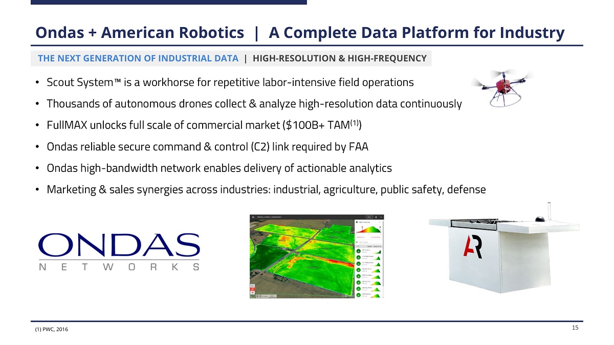 Investment Highlights • Ondas owns the critical IP supporting IEEE standards 802.16s and 802.16t (Industrial wireless broadband) • Aggregates scarce, low - frequency spectrum; enables low - cost, high - performance private licensed broadband networks • Enables Fog and Edge computing along with adoption of Drone and sensors - based data solutions Massive global TAM – Legacy network upgrades and MC - IoT / Drone adoption 2 4 5 Disruptive FullMAX software - based wireless platform, network solution required for MC - IOT • Legacy private industrial networks are end - of - life, urgently require upgrades • Fog and Edge computing along with sensors - based solutions drive ROI for MC - IoT investments • Drone is the “ultimate data gathering edge device for a mission - critical network” Large Class 1 Rail and AURA Drone networks; blue - chip ScoutTM customer pipeline • FullMAX software platform allows critical field area operations to run more efficiently and safely • Global, Tier 1 industrial vendors such as Siemens support adoption given synergies of MC - IoT solution • Pent - up demand for ground - breaking Scout System TM ; customer pipeline surging post - FAA approval Attractive financial model, capital light, recurring revenue and high margins • FullMAX platform is large system sale, with recurring system and software maintenance • Robot - as - a - Service (RaaS) enhances margin profile and recurring revenue stream American Robotics acquisition enhances MC - IoT platform and business model • First and ONLY fully autonomous drone with FAA approval for BVLOS operation • Provides access to continuous industrial data stream not previously available; Data is the product – not aircraft • Deep customer relationships introduces new cross - selling revenue opportunities 1 3 4 Source: Company Information.