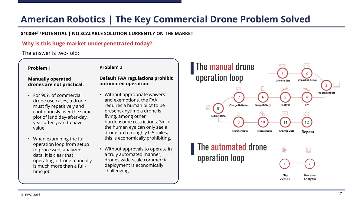American Robotics | The Key Commercial Drone Problem Solved $100B+ (1) POTENTIAL | NO SCALABLE SOLUTION CURRENTLY ON THE MARKET Why is this huge market underpenetrated today? The answer is two - fold: Problem 1 Manually operated drones are not practical. • For 90% of commercial drone use cases, a drone must fly repetitively and continuously over the same plot of land day - after - day, year - after - year, to have value. • When examining the full operation loop from setup to processed, analyzed data, it is clear that operating a drone manually is much more than a full - time job. Problem 2 D e f au l t FA A r e g u l ati o n s p ro h ibi t automated operation. • Without appropriate waivers and exemptions, the FAA requires a human pilot to be present anytime a drone is flying, among other burdensome restrictions. Since the human eye can only see a drone up to roughly 0.5 miles, this is economically prohibiting. • Without approvals to operate in a truly automated manner, drones wide - scale commercial deployment is economically challenging. T he m a n u a l d r o n e operation loop T he a u t om a t e d d r o n e operation loop 1 Sip coffee 2 Rece i v e ana l y s i s ( 1 ) P W C , 201 6 17