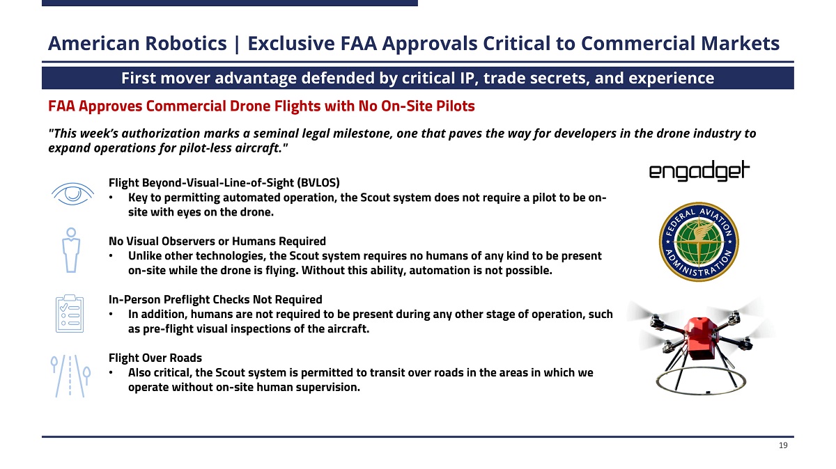 American Robotics | Exclusive FAA Approvals Critical to Commercial Markets First mover advantage defended by critical IP, trade secrets, and experience FAA Approves Commercial Drone Flights with No On - Site Pilots "This week’s authorization marks a seminal legal milestone, one that paves the way for developers in the drone industry to expand operations for pilot - less aircraft." Flight Beyond - Visual - Line - of - Sight (BVLOS) • Key to permitting automated operation, the Scout system does not require a pilot to be on - site with eyes on the drone. No Visual Observers or Humans Required • Unlike other technologies, the Scout system requires no humans of any kind to be present on - site while the drone is flying. Without this ability, automation is not possible. In - Person Preflight Checks Not Required • In addition, humans are not required to be present during any other stage of operation, such as pre - flight visual inspections of the aircraft. Flight Over Roads • Also critical, the Scout system is permitted to transit over roads in the areas in which we operate without on - site human supervision. 19