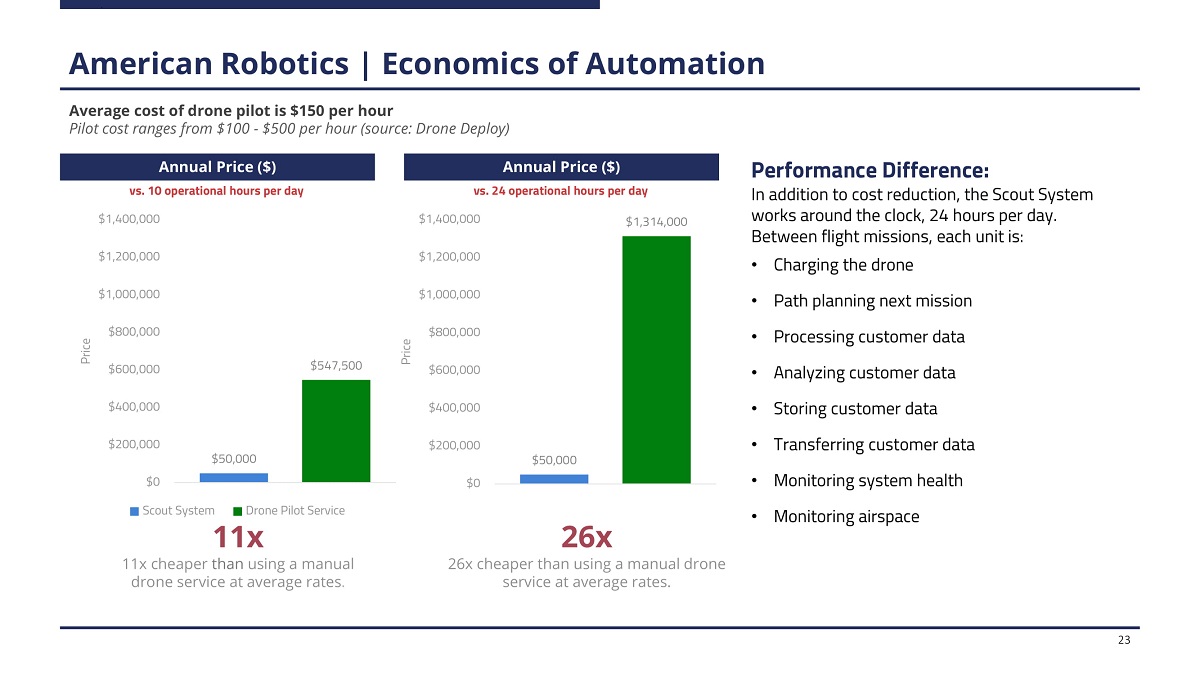 American Robotics | Robot - as - a - Service (RAAS) • R aaS m o d el b u n d les h ar d w ar e, s o f tw ar e, o per at i o n s , a n d maintenance into one annual subscription fee. This has 2 effects: 1) It lowers the annual cost of data acquisition via drone to what AR believes is ten times less than current methods 2) it provides the Company with recurring software - like margins. • Also allows for continued software improvements, upgrades, and new features that can be monetized through tiered pricing and app s t o r e - l i ke c o n ce p t , a ll o w i n g f o r c o n t i n u e d u s e r e x p e r i e n c e improvement and potential increase in revenue per unit over time. True automation allows for a complete solution and attractive business model ANNUAL SUBSCRIPTION FOR SERVICE The Scout System is bundled into an annual subscription fee, encompassing the full suite of hardware, software, and services, allowing American Robotics to provide customers the highest performing product at the lowest possible cost. REAL - TIME AUTOMATED OPERATION Once installed, each Scout system operates at its maximum capacity. Automated missions occur multiple times per day, guaranteeing customers the best data at the highest frequency. LOW UPFRONT CAPITAL COSTS The Robot - as - a - Service (RaaS) model allows American Robotics to lower the burden of upfront manufacturing and hardware costs. Aside from initial installation and shipping costs, all customers pay for is the service the Scout system provides. NO LONG - TERM RISK Subscription fees are billed annually, and replacement units can be swapped out at the end of the service life. American Robotics will also periodically install new software updates and provide access to the new features, assuring industry - best performance throughout a customer's subscription . NO MAINTENANCE RESPOSIBILITIES American Robotics staff remotely oversee the operation of customer units and manage routine and unscheduled maintenance requirements. NO CUSTOMER PILOT TRAINING Both the technology itself and American Robotics' staff oversee the real time operation of a customer's units. Health status and performance are constantly monitored to assure optimal performance, and no pilot training is required for a customer's staff to integrate t his technology into their business. 22