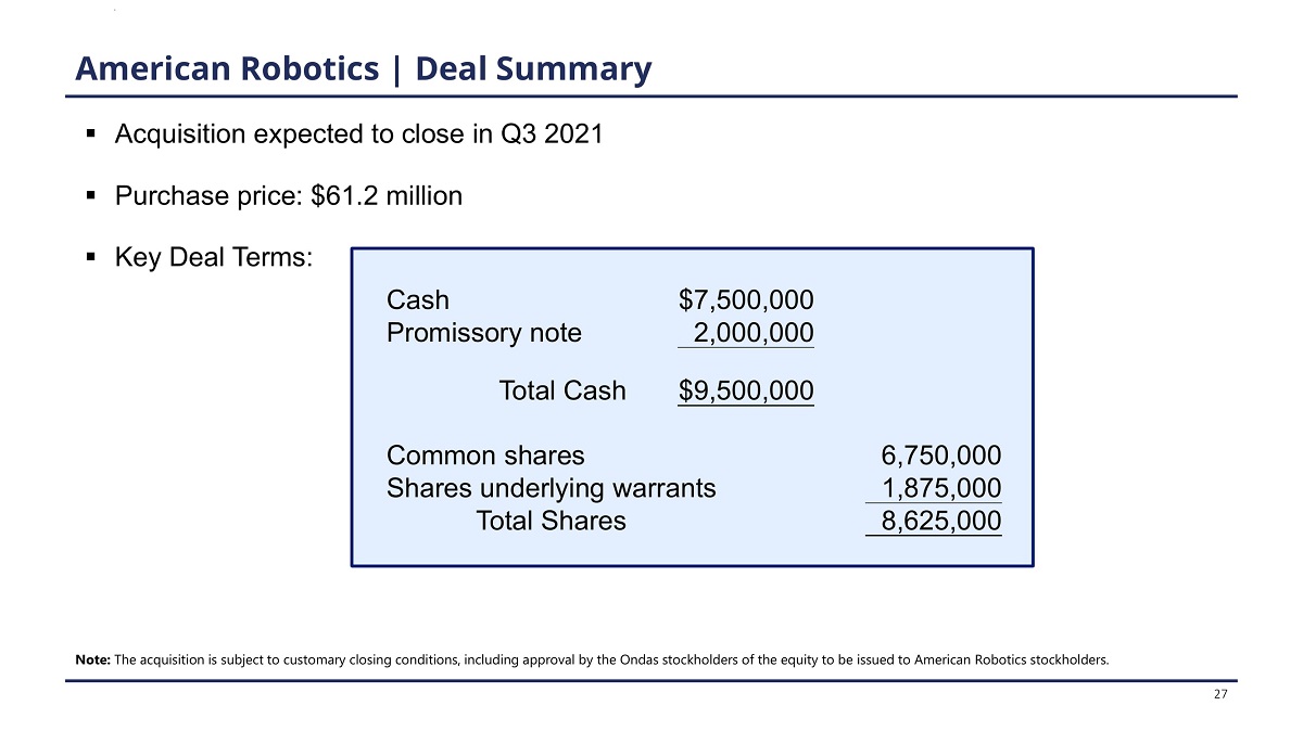 American Robotics | Deal Summary 27 ▪ Acquisition expected to close in Q3 2021 ▪ Purchase price: $61.2 million ▪ Key Deal Terms: Cash $7,500,000 Promissory note 2,000,000 Total Cash $9,500,000 Common shares 6,750,000 Shares underlying warrants 1,875,000 Total Shares 8,625,000 Note: The acquisition is subject to customary closing conditions, including approval by the Ondas stockholders of the equity to be issued to American Robotics stockholders.