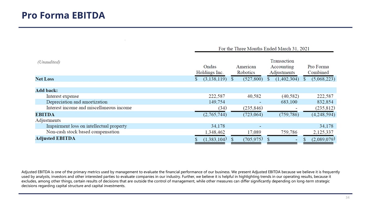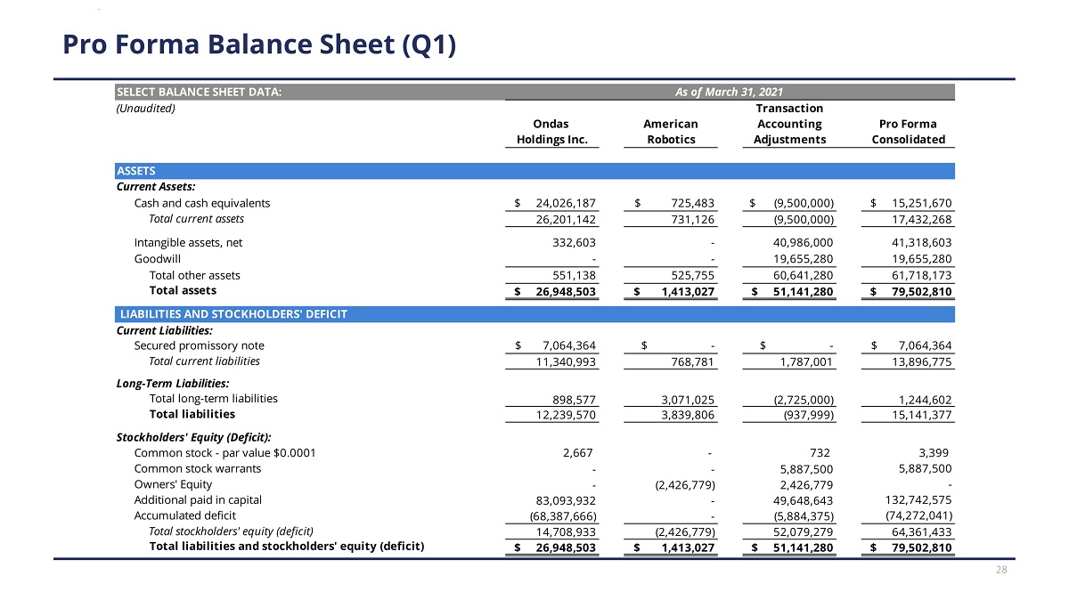 Pro Forma Balance Sheet (Q1) (Unaudited) Transaction A cc o un t in g P r o F o r m a Ondas H o l d in g s In c . American Robotics Adjustments Consolidated S EL E C T B A L A N C E S H EE T D A T A : A s o f M a r c h 31 , 202 1 C u rr e n t A ss e t s: Cash and cash equivalents $ 24,026,187 $ 725,483 $ (9,500,000) $ 15,251,670 Total current assets 26,201,142 731,126 (9,500,000) 17,432,268 Intangible assets, net 332,603 - 40,986,000 41,318,603 Goodwill - - 19,655,280 19,655,280 Total other assets 551,138 525,755 60,641,280 61,718,173 Total assets $ 26,948,503 $ 1,413,027 $ 51,141,280 $ 79,502,810 Current Liabilities: Secured promissory note $ 7,064,364 $ - $ - $ 7,064,364 Total current liabilities 11,340,993 768,781 1,787,001 13,896,775 Long - Term Liabilities: Total long - term liabilities 898,577 3,071,025 (2,725,000) 1,244,602 Total liabilities 12,239,570 3,839,806 (937,999) 15,141,377 Stockholders' Equity (Deficit): Common stock - par value $0.0001 2,667 - 732 3,399 Common stock warrants - - 5,887,500 5,887,500 Owners' Equity - (2,426,779) 2,426,779 - Additional paid in capital 83,093,932 - 49,648,643 132,742,575 Accumulated deficit (68,387,666) - (5,884,375) (74,272,041) Total stockholders' equity (deficit) 14,708,933 (2,426,779) 52,079,279 64,361,433 Total liabilities and stockholders' equity (deficit) $ 26,948,503 $ 1,413,027 $ 51,141,280 $ 79,502,810 ASSETS LIABILITIES AND STOCKHOLDERS' DEFICIT 28