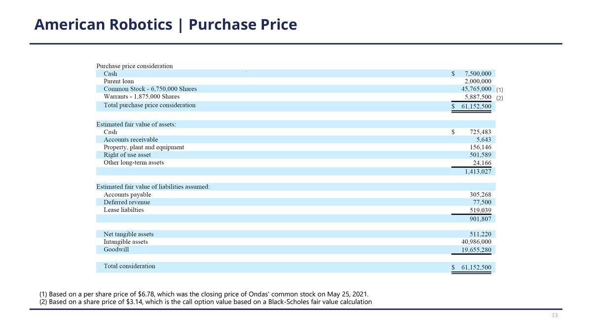 American Robotics | Purchase Price (1) Based on a per share price of $6.78, which was the closing price of Ondas' common stock on May 25, 2021. (2) Based on a share price of $3.14, which is the call option value based on a Black - Scholes fair value calculation 33 ( 1 ) ( 2 )