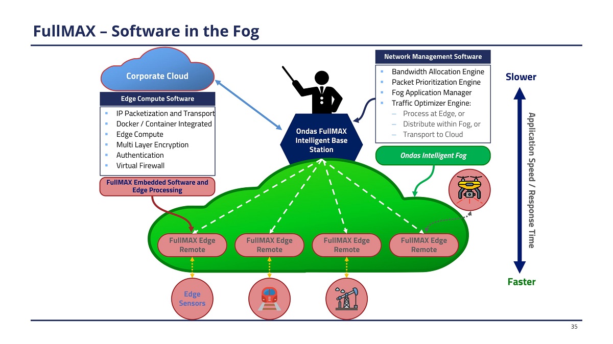 Corporate Cloud ▪ I P P ack e t i z at i on an d Tran s p o rt ▪ D o c k e r / C o n ta i n e r In t e g rat e d ▪ E d g e C o mp ute ▪ M ult i La y e r E n cr y p t io n ▪ Authentication ▪ V i rtua l F i r e w all Ondas FullMAX In telli g en t B a s e Station F u ll M A X Edge Remote F u ll M A X Edge Remote F ullM AX – S of t w are i n th e Fog F u ll M A X Edge Remote F u ll M A X Edge Remote ▪ Ban d w i d t h All o cat i on E n g i n e ▪ P ack e t P r i o r it i z at i on E n g i n e ▪ F o g Ap p l icat i on M an a g e r ▪ Traff i c O p t i m i z e r E n g i n e : – Pr o c e ss a t Ed g e , or – D i s tr i bute w i th i n F o g , o r – Tran s p o r t t o C l oud Network Management Software Ondas Intelligent Fog FullMAX Embedded Software and Edge Processing Edge S e n sors F a s ter 35 Application Speed / Response Time S lo w e r Edge Compute Software