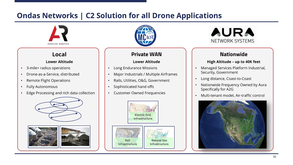 Ondas Networks | C2 Solution for all Drone Applications Local Lower Altitude • 3 - mile+ radius operations • Drone - as - a - Service, distributed • Remote Flight Operations • Fully Autonomous • Edge Processing and rich data collection Private WAN Lower Altitude • Long Endurance Missions • Major Industrials / Multiple Airframes • Rails, Utilities, O&G, Government • Sophisticated hand offs • Customer Owned Frequencies Nationwide Hig h Alt i t u d e – u p t o 40 K feet • Managed Services Platform Industrial, Security, Government • Long distance, Coast - to - Coast • Nationwide Frequency Owned by Aura Specifically for A2G • Multi - tenant model, Air - traffic control Electric Grid I n f r a s t r uct ur e Rail I n f r a s t r uct ur e Natural Gas I n f r a s t r uct ur e 36