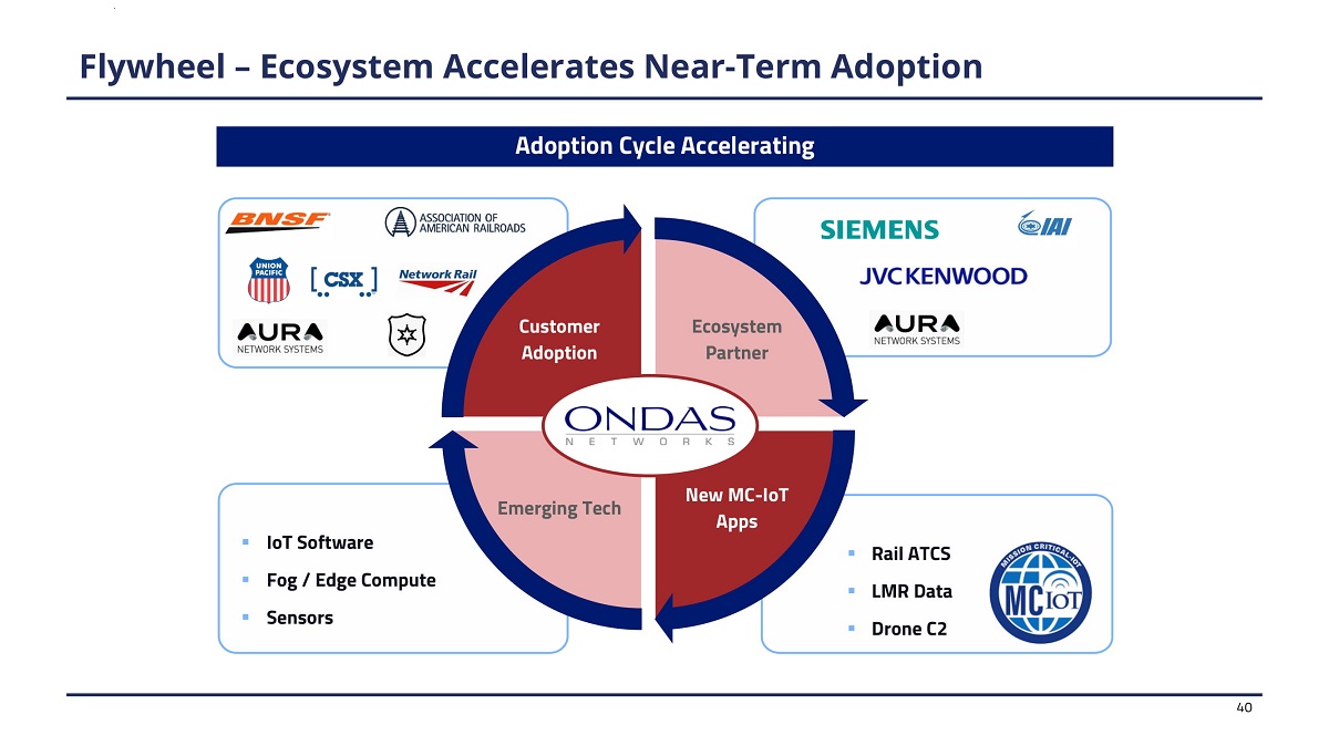 ▪ R a i l A T C S ▪ LMR Data ▪ Drone C2 ▪ IoT Software ▪ Fog / Edge Compute ▪ Sensors Adoption Cycle Accelerating F l y w h ee l – E cos ys t e m A cc e l e rat e s N e ar - T e r m A d o p t i on 40 Ecosy st e m Partner New MC - IoT Apps Emerging Tech C us to m er Adoption