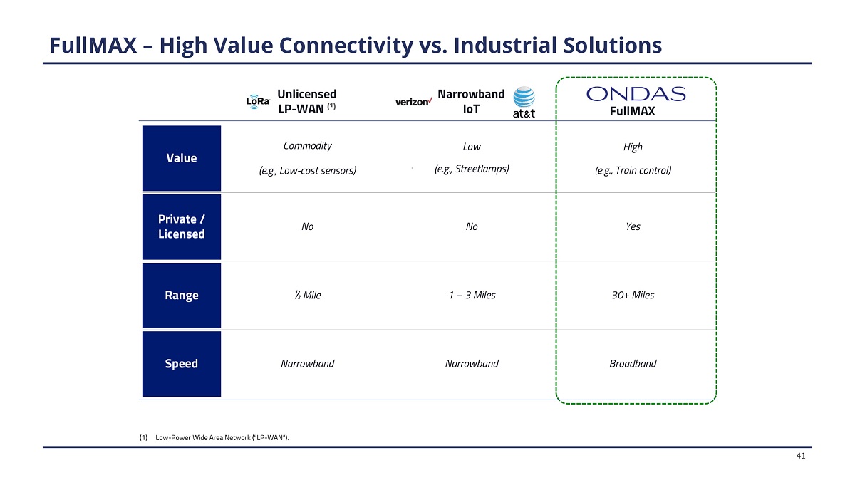 (1) Low - Power Wide Area Network (“LP - WAN”). U n l icen se d LP - WAN ( ¹ ) N a rro w b and IoT F u llMA X Value Commodity (e .g., Lo w - cost s e nso rs ) Low (e .g., St ree tlamps) High (e .g., T r a i n cont r ol) Private / L i censed No No Yes Range ½ M i le 1 – 3 Miles 30+ Miles Speed Narrowband Narrowband Broadband FullMAX – High Value Connectivity vs. Industrial Solutions 41