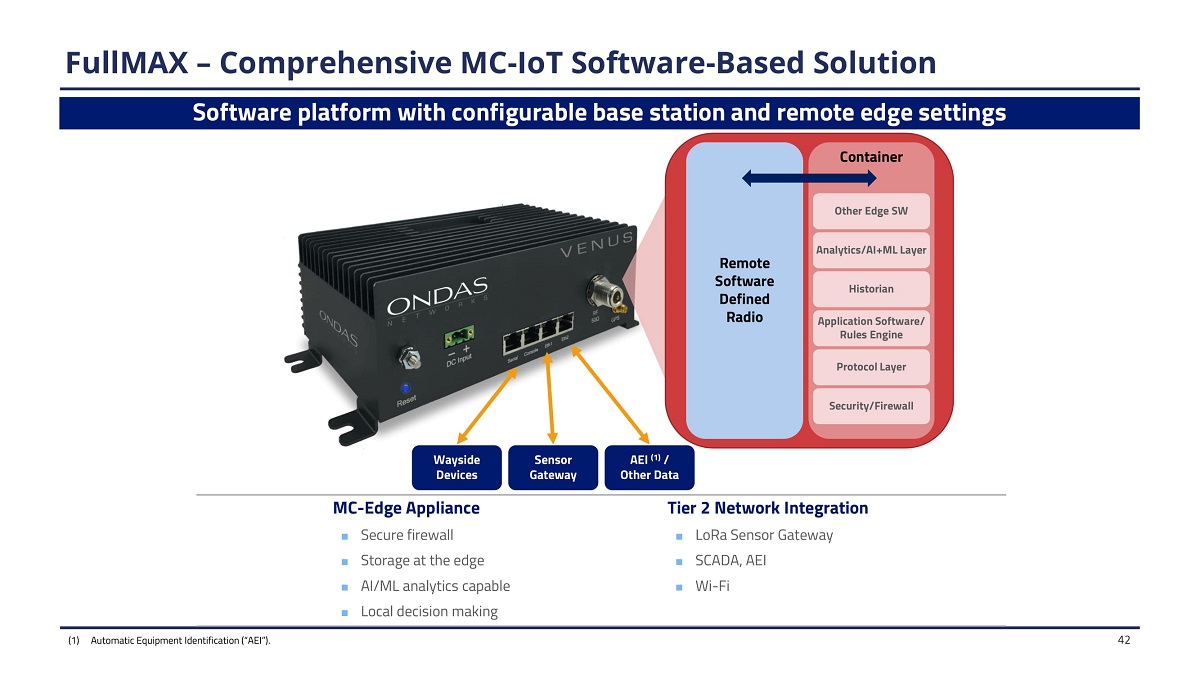 (1 ) A u t o m a t i c E q uipmen t I d en t ifi c a t ion (“ A E I ”). S e cure f i r e w all S t o ra g e a t t h e e dge AI/ M L an al yt i c s cap able L o ca l de c is io n ma k i n g FullMAX – Comprehensive MC - IoT Software - Based Solution Software platform with configurable base station and remote edge settings Wa y s i d e Devices MC - Edge Appliance Sensor G at e w ay Remote S oft wa re Defined Radio Container Protocol Layer Security/Firewall A pp l i ca t i on S oftwa re / Rules Engine H i st ori a n Other Edge SW Analytics/AI+ML Layer AEI (1) / Other Data Tier 2 Network Integration L o R a S e n s o r Gate w ay S C A D A , A E I Wi - Fi 42