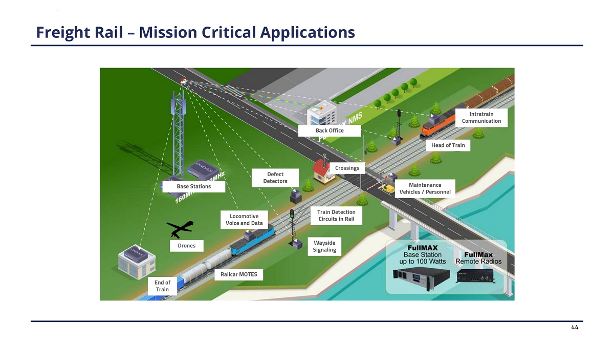 O p e r at e s as a B ase S tati o n o r a R e mo t e R a d i o Narr o w ba n d o r Br o a d b a n d O p era t i o n Mo b i l e a n d F i x ed Primarily Base Station Application I n c r e a s ed P r o c e ss i n g P o we r ( X 12 A R M ) fo r 1000 s o f r e mo t es MI M O 2 x 2 (e n h a n c e d c o ve r a g e , u p t o 2 x thr o ug h p u t ) Primarily Base Station Application I n c r e a s ed P r o c e ss i n g P o we r ( X 12 ARM) Ve r y H i g h T X P ow e r ( u p t o 100 Watts) MI M O 1 x 2 (e n h a n c e d c o ve r a g e) P ri m a ri l y Re m o t e Ra d i o M o bi l e & Fi x e d Dust, W at e r , S h o c k , and V i b r ati o n Resistant Dr o n e s and M o b il e I nsta l l a ti o n L o w C o st / C o mp ac t R e m o te R a d io S i ngl e B o a rd D e s i gn Hi g h V o lume II o T R a d i o Neptune Mercury Siemens ATCS (1) H i gh - p o we r Edg e A p p l i a nc e Backwards compatible with legacy system O n d as str at e g i c p ar tn er Core Network and Edge Devices Host FullMAX Software Platform Venus Jupiter Mars F ullM AX – S o f t w a r e De fine d R a d i o ( S DR ) P l a t f o r ms 43 (1) ATCS = “Advanced Train Control System.”