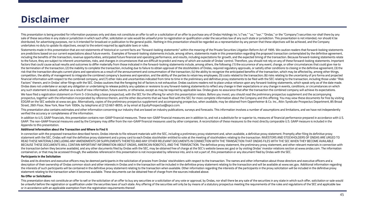 Disclaimer This presentation is being provided for information purposes only and does not constitute an offer to sell or a solicitation of an offer to purchase any of Ondas Holdings Inc.’s (“we,” “us,” “our,” “Ondas,” or the “Company”) securities nor shall there by any sale of these securities in any state or jurisdiction in which such offer, solicitation or sale would be unlawful prior to registration or qualification under the securities law of any such state or jurisdiction. This presentation is not intended, nor should it be distributed, for advertising purposes, nor is it intended for broadcast or publication to the general public. Nothing in this presentation should be regarded as a representation by any person that these objectives will be achieved, and the Company undertakes no duty to update its objectives, except to the extent required by applicable laws or rules. Statements made in this presentation that are not statements of historical or current facts are “forward - looking statements” within the meaning of the Private Securities Litigation Reform Act of 1995. We caution readers that forward - looking statements are predictions based on our current expectations about future events. Examples of forward - looking statements include, among others, statements made in this presentation regarding the proposed transaction contemplated by the definitive agreement, including the benefits of the transaction, revenue opportunities, anticipated future financial and operating performance, and results, including expectations for growth, and the expected timing of the transaction. Because forward - looking statements relate to the future, they are subject to inherent uncertainties, risks, and changes in circumstances that are difficult to predict and many of which are outside of Ondas' control. Therefore, you should not rely on any of these forward - looking statements. Important factors that could cause actual results and outcomes to differ materially from those indicated in the forward - looking statements include, among others, the following: (1) the occurrence of any event, change, or other circumstances that could give rise to the termination of the transaction; (2) the inability to complete the transaction, including due to failure to obtain approval of the stockholders of Ondas, required regulatory approvals, or satisfy other conditions to closing in the definitive agreement; (3) the risk that the transaction disrupts current plans and operations as a result of the announcement and consummation of the transaction; (4) the ability to recognize the anticipated benefits of the transaction, which may be affected by, among other things, competition, the ability of management to integrate the combined company's business and operation, and the ability of the parties to retain key employees; (5) costs related to the transaction; (6) risks relating to the uncertainty of pro forma and projected financial information with respect to the combined company; and (7) other risks and uncertainties indicated from time to time in the preliminary and definitive proxy statements to be filed with the SEC relating to the transaction, including those under “Risk Factors” therein, and in Ondas' other filings with the SEC. Ondas cautions that the foregoing list of factors is not exhaustive. Ondas cautions readers not to place undue reliance upon any forward - looking statements, which speak only as of the date made. Ondas does not undertake or accept any obligation or undertaking to release publicly any updates or revisions to any forward - looking statements to reflect any change in their expectations or any change in events, conditions, or circumstances on which any such statement is based, whether as a result of new information, future events, or otherwise, except as may be required by applicable law. Ondas gives no assurance that after the transaction the combined company will achieve its expectations. We have filed a registration statement on Form S - 3 (including a base prospectus), with the SEC for the offering for which this presentation relates. Before you invest, you should read the preliminary prospectus supplement and the accompanying prospectus, together with the information incorporated by reference therein, and the other documents that we have filed with the SEC for more complete information about the Company and this offering. You may view these documents for free by visiting EDGAR on the SEC website at www.sec.gov. Alternatively, copies of the preliminary prospectus supplement and accompanying prospectus, when available, may be obtained from Oppenheimer & Co. Inc., Attn: Syndicate Prospectus Department, 85 Broad Street, 26th Floor, New York, New York 10004, by telephone at (212) 667 - 8055, or by email at EquityProspectus@opco.com. This presentation also contains estimates and other information concerning our industry that are based on industry publications, surveys and forecasts. This information involves a number of assumptions and limitations, and we have not independently verified the accuracy or completeness of the information. In addition to U.S. GAAP financials, this presentation contains non - GAAP financial measures. These non - GAAP financial measures are in addition to, and not a substitute for or superior to, measures of financial performance prepared in accordance with U.S. GAAP. The non - GAAP financial measures used by the Company may differ from the non - GAAP financial measures used by other companies. A reconciliation of these measures to the most directly comparable U.S. GAAP measure is included in the Appendix to this presentation. Additional Information about the Transaction and Where to Find It In connection with the proposed transaction described herein, Ondas intends to file relevant materials with the SEC, including a preliminary proxy statement and, when available, a definitive proxy statement. Promptly after filing its definitive proxy
