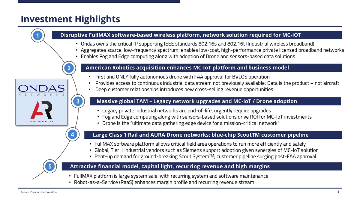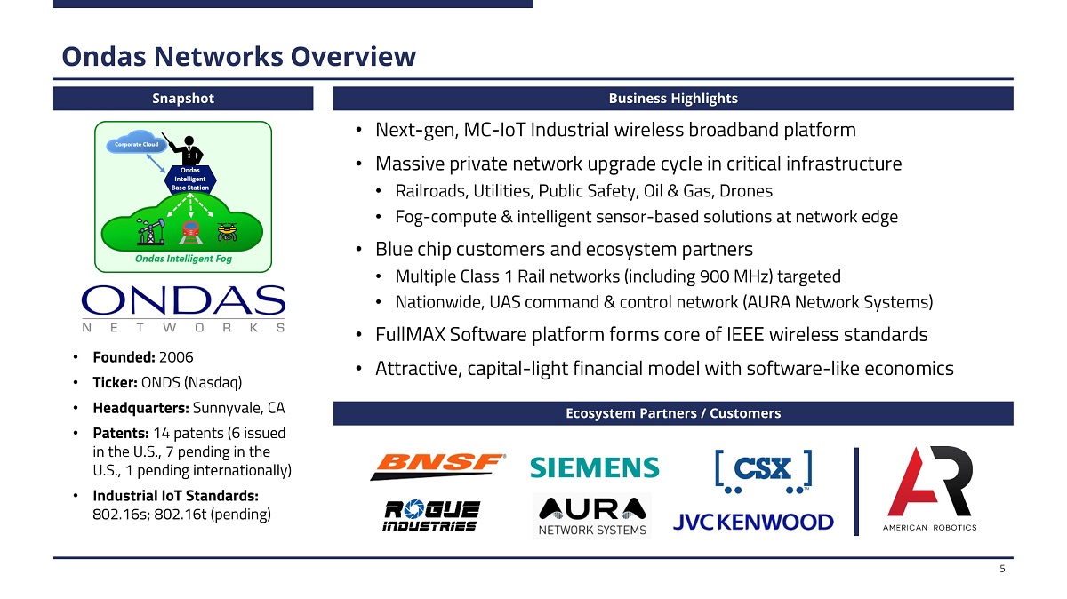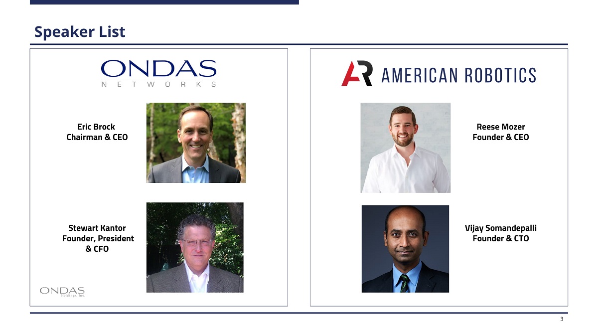Disclaimer This presentation is being provided for information purposes only and does not constitute an offer to sell or a solicitation of an offer to purchase any of Ondas Holdings Inc.’s (“we,” “us,” “our,” “Ondas,” or the “Company”) securities nor shall there by any sale of these securities in any state or jurisdiction in which such offer, solicitation or sale would be unlawful prior to registration or qualification under the securities law of any such state or jurisdiction. This presentation is not intended, nor should it be distributed, for advertising purposes, nor is it intended for broadcast or publication to the general public. Nothing in this presentation should be regarded as a representation by any person that these objectives will be achieved, and the Company undertakes no duty to update its objectives, except to the extent required by applicable laws or rules. Statements made in this presentation that are not statements of historical or current facts are “forward - looking statements” within the meaning of the Private Securities Litigation Reform Act of 1995. We caution readers that forward - looking statements are predictions based on our current expectations about future events. Examples of forward - looking statements include, among others, statements made in this presentation regarding the proposed transaction contemplated by the definitive agreement, including the benefits of the transaction, revenue opportunities, anticipated future financial and operating performance, and results, including expectations for growth, and the expected timing of the transaction. Because forward - looking statements relate to the future, they are subject to inherent uncertainties, risks, and changes in circumstances that are difficult to predict and many of which are outside of Ondas' control. Therefore, you should not rely on any of these forward - looking statements. Important factors that could cause actual results and outcomes to differ materially from those indicated in the forward - looking statements include, among others, the following: (1) the occurrence of any event, change, or other circumstances that could give rise to the termination of the transaction; (2) the inability to complete the transaction, including due to failure to obtain approval of the stockholders of Ondas, required regulatory approvals, or satisfy other conditions to closing in the definitive agreement; (3) the risk that the transaction disrupts current plans and operations as a result of the announcement and consummation of the transaction; (4) the ability to recognize the anticipated benefits of the transaction, which may be affected by, among other things, competition, the ability of management to integrate the combined company's business and operation, and the ability of the parties to retain key employees; (5) costs related to the transaction; (6) risks relating to the uncertainty of pro forma and projected financial information with respect to the combined company; and (7) other risks and uncertainties indicated from time to time in the preliminary and definitive proxy statements to be filed with the SEC relating to the transaction, including those under “Risk Factors” therein, and in Ondas' other filings with the SEC. Ondas cautions that the foregoing list of factors is not exhaustive. Ondas cautions readers not to place undue reliance upon any forward - looking statements, which speak only as of the date made. Ondas does not undertake or accept any obligation or undertaking to release publicly any updates or revisions to any forward - looking statements to reflect any change in their expectations or any change in events, conditions, or circumstances on which any such statement is based, whether as a result of new information, future events, or otherwise, except as may be required by applicable law. Ondas gives no assurance that after the transaction the combined company will achieve its expectations. We have filed a registration statement on Form S - 3 (including a base prospectus), with the SEC for the offering for which this presentation relates. Before you invest, you should read the preliminary prospectus supplement and the accompanying prospectus, together with the information incorporated by reference therein, and the other documents that we have filed with the SEC for more complete information about the Company and this offering. You may view these documents for free by visiting EDGAR on the SEC website at www.sec.gov. Alternatively, copies of the preliminary prospectus supplement and accompanying prospectus, when available, may be obtained from Oppenheimer & Co. Inc., Attn: Syndicate Prospectus Department, 85 Broad Street, 26th Floor, New York, New York 10004, by telephone at (212) 667 - 8055, or by email at EquityProspectus@opco.com. This presentation also contains estimates and other information concerning our industry that are based on industry publications, surveys and forecasts. This information involves a number of assumptions and limitations, and we have not independently verified the accuracy or completeness of the information. In addition to U.S. GAAP financials, this presentation contains non - GAAP financial measures. These non - GAAP financial measures are in addition to, and not a substitute for or superior to, measures of financial performance prepared in accordance with U.S. GAAP. The non - GAAP financial measures used by the Company may differ from the non - GAAP financial measures used by other companies. A reconciliation of these measures to the most directly comparable U.S. GAAP measure is included in the Appendix to this presentation. Additional Information about the Transaction and Where to Find It In connection with the proposed transaction described herein, Ondas intends to file relevant materials with the SEC, including a preliminary proxy statement and, when available, a definitive proxy statement. Promptly after filing its definitive proxy