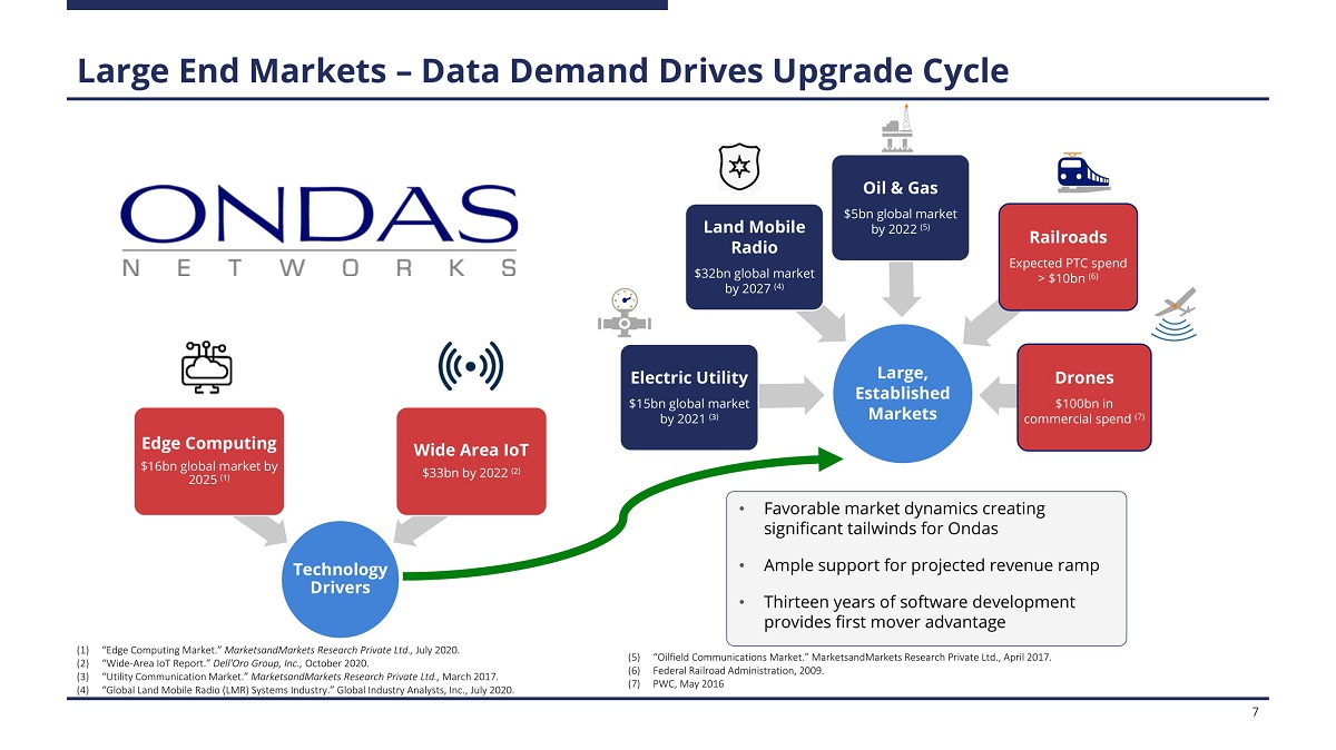 Investment Highlights • Ondas owns the critical IP supporting IEEE standards 802.16s and 802.16t (Industrial wireless broadband) • Aggregates scarce, low - frequency spectrum; enables low - cost, high - performance private licensed broadband networks • Enables Fog and Edge computing along with adoption of Drone and sensors - based data solutions Massive global TAM – Legacy network upgrades and MC - IoT / Drone adoption 2 4 5 Disruptive FullMAX software - based wireless platform, network solution required for MC - IOT • Legacy private industrial networks are end - of - life, urgently require upgrades • Fog and Edge computing along with sensors - based solutions drive ROI for MC - IoT investments • Drone is the “ultimate data gathering edge device for a mission - critical network” Large Class 1 Rail and AURA Drone networks; blue - chip ScoutTM customer pipeline • FullMAX software platform allows critical field area operations to run more efficiently and safely • Global, Tier 1 industrial vendors such as Siemens support adoption given synergies of MC - IoT solution • Pent - up demand for ground - breaking Scout System TM ; customer pipeline surging post - FAA approval Attractive financial model, capital light, recurring revenue and high margins • FullMAX platform is large system sale, with recurring system and software maintenance • Robot - as - a - Service (RaaS) enhances margin profile and recurring revenue stream American Robotics acquisition enhances MC - IoT platform and business model • First and ONLY fully autonomous drone with FAA approval for BVLOS operation • Provides access to continuous industrial data stream not previously available; Data is the product – not aircraft • Deep customer relationships introduces new cross - selling revenue opportunities 1 3 4 Source: Company Information.