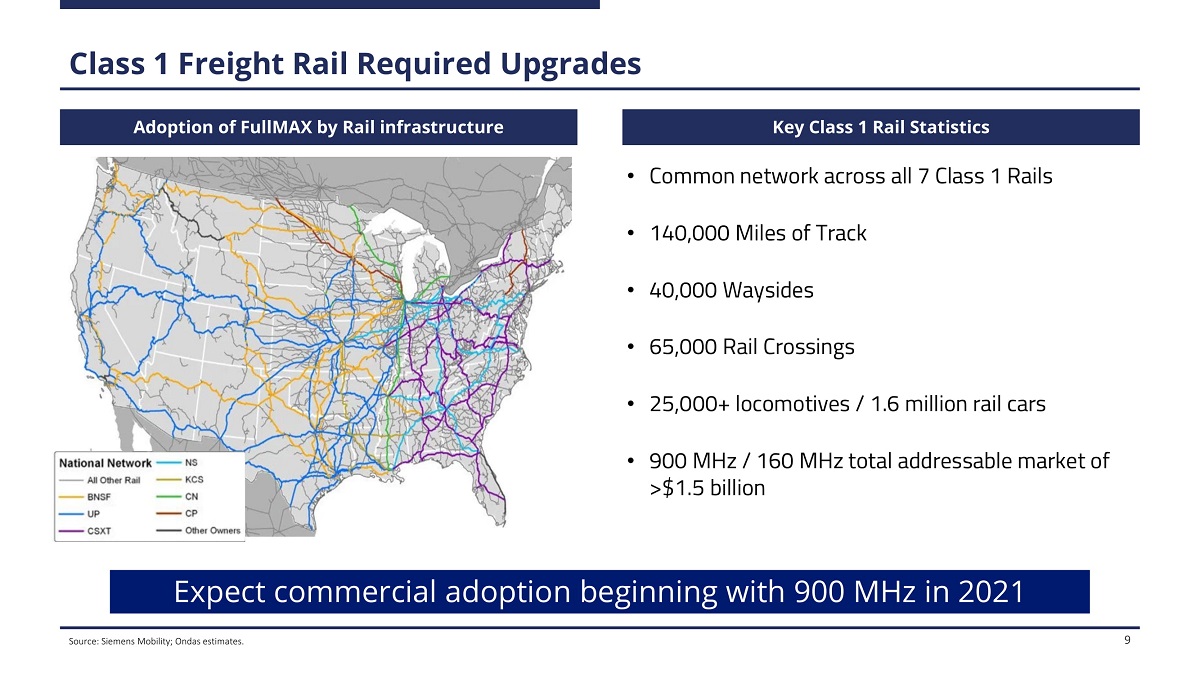 FullMAX Enables Safer Rails, Faster Trains ~5% Productivity Increase ~$4.5 billion Additional Revenue for Railroads Onboard Te l e m e t ry A T CS V o i c e PT C FullMAX S o f t w are Platform Onboard T e l e m e try 450MHZ ATCS 90 0 M H z Voice 16 0 M H z PTC 22 0 M H z Legacy Systems Ondas Intelligent Fog • Multiple, siloed, single - purpose networks • Narrowband capacity • Not upgradable • Legacy applications • Lower speed networks • End of life systems • Single, multi - band platform • Broadband capacity • Future - proof, upgradeable Edge • New, MC - IoT applications • Increased data rates / throughput • More efficient network operations FCC Upgrade M an d at e 8