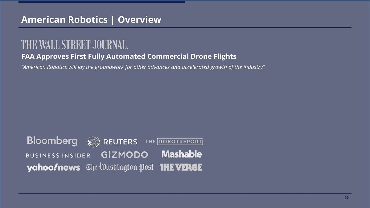 American Robotics | Overview 16 F AA A pp r o v e s F i rs t F u ll y A u t o m ate d C o mm erc i a l D r o n e F li g h ts “American Robotics will lay the groundwork for other advances and accelerated growth of the industry”