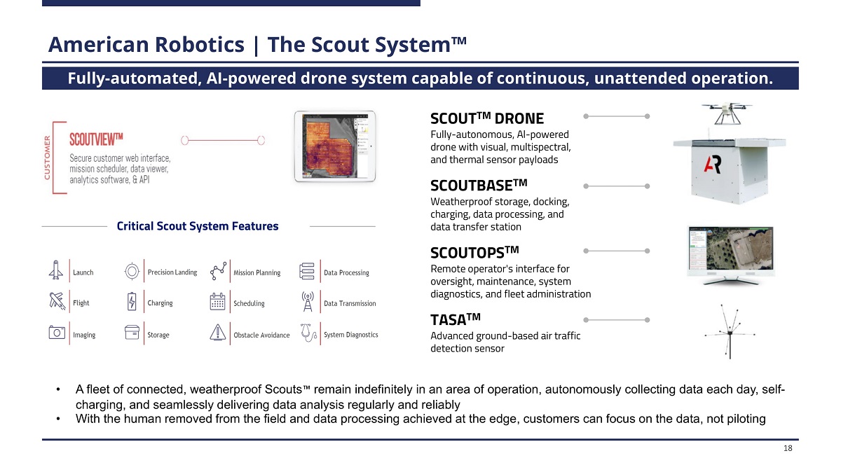 American Robotics | The Scout System Fully - automated, AI - powered drone system capable of continuous, unattended operation. Critical Scout System Features SCOUT TM DRONE Full y - aut o n o m o u s , Al - p o w e r e d d r on e w i t h v i s ual , mult i s p e ctral, an d th e rma l s e n s o r p a y l o a d s SCOUTBASE TM W e ath e rp r o o f st o ra g e , d o c k i n g , ch ar g i n g , d at a p r o c e ss i n g , an d d at a tran s f e r s tat i on SCOUTOPS TM R e m o t e o p e rat o r ' s i n t e rfac e f o r oversight, maintenance, system diagnostics, and fleet administration TASA TM A d van c e d g r oun d - ba s e d a i r traff i c d e t e c t i on se n sor • A fleet of connected, weatherproof Scouts remain indefinitely in an area of operation, autonomously collecting data each day, self - charging, and seamlessly delivering data analysis regularly and reliably • With the human removed from the field and data processing achieved at the edge, customers can focus on the data, not piloting 18