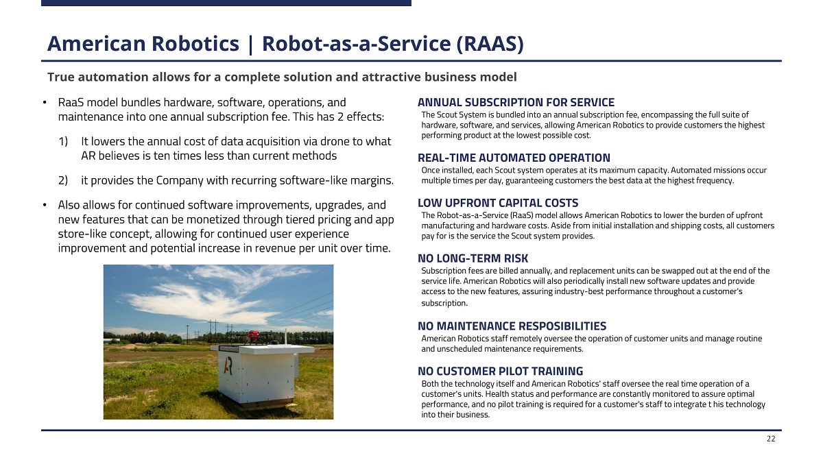 American Robotics | Robot - as - a - Service (RAAS) • R aaS m o d el b u n d les h ar d w ar e, s o f tw ar e, o per at i o n s , a n d maintenance into one annual subscription fee. This has 2 effects: 1) It lowers the annual cost of data acquisition via drone to what AR believes is ten times less than current methods 2) it provides the Company with recurring software - like margins. • Also allows for continued software improvements, upgrades, and new features that can be monetized through tiered pricing and app s t o r e - l i ke c o n ce p t , a ll o w i n g f o r c o n t i n u e d u s e r e x p e r i e n c e improvement and potential increase in revenue per unit over time. True automation allows for a complete solution and attractive business model ANNUAL SUBSCRIPTION FOR SERVICE The Scout System is bundled into an annual subscription fee, encompassing the full suite of hardware, software, and services, allowing American Robotics to provide customers the highest performing product at the lowest possible cost. REAL - TIME AUTOMATED OPERATION Once installed, each Scout system operates at its maximum capacity. Automated missions occur multiple times per day, guaranteeing customers the best data at the highest frequency. LOW UPFRONT CAPITAL COSTS The Robot - as - a - Service (RaaS) model allows American Robotics to lower the burden of upfront manufacturing and hardware costs. Aside from initial installation and shipping costs, all customers pay for is the service the Scout system provides. NO LONG - TERM RISK Subscription fees are billed annually, and replacement units can be swapped out at the end of the service life. American Robotics will also periodically install new software updates and provide access to the new features, assuring industry - best performance throughout a customer's subscription . NO MAINTENANCE RESPOSIBILITIES American Robotics staff remotely oversee the operation of customer units and manage routine and unscheduled maintenance requirements. NO CUSTOMER PILOT TRAINING Both the technology itself and American Robotics' staff oversee the real time operation of a customer's units. Health status and performance are constantly monitored to assure optimal performance, and no pilot training is required for a customer's staff to integrate t his technology into their business. 22