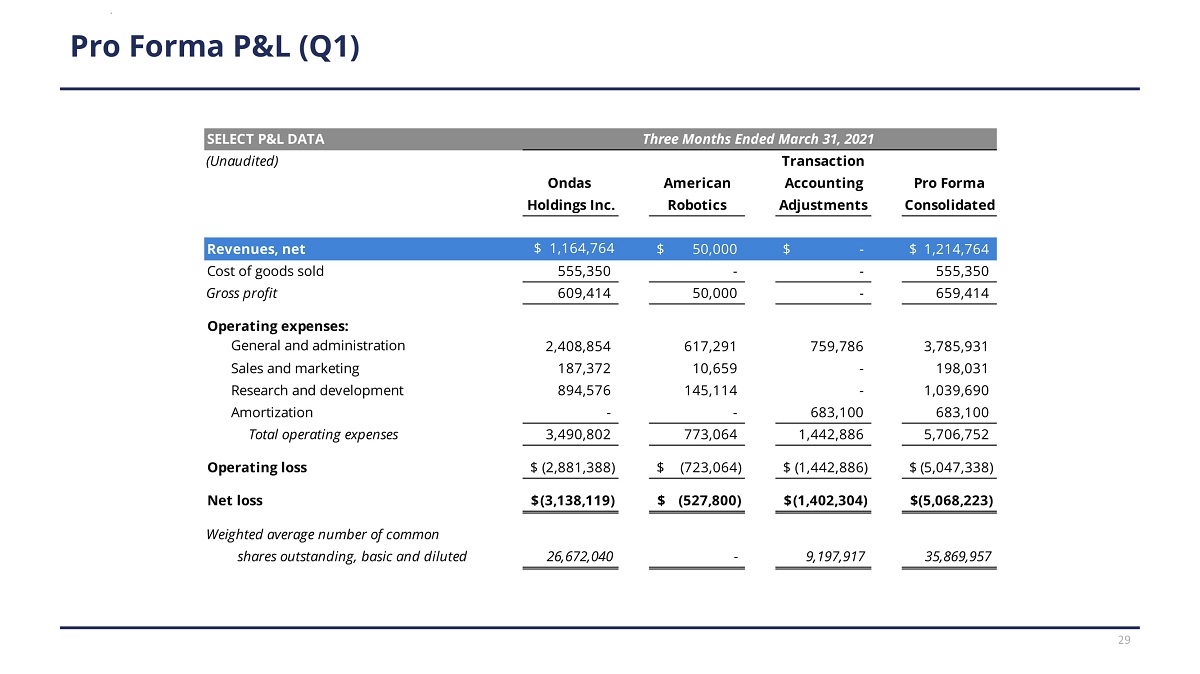 Pro Forma P&L (Q1) SELECT P&L DATA Three Months Ended March 31, 2021 (Unaudited) Transaction Ondas American Accounting Pro Forma Holdings Inc. Robotics Adjustments Consolidated Revenues, net $ 1,164,764 $ 50,000 $ - $ 1,214,764 Cost of goods sold 555,350 - - 555,350 G r os s p r o f i t 609,414 50,000 - 659,414 Operating expenses: General and administration 2,408,854 617,291 759,786 3,785,931 S a l e s a n d m a r k e t i n g 187,372 10,659 - 198,031 Research and development 894,576 145,114 - 1,039,690 Amortization - - 683,100 683,100 Total operating expenses 3,490,802 773,064 1,442,886 5,706,752 Operating loss $ (2,881,388) $ (723,064) $ (1,442,886) $ ( 5 , 047 , 338) Net loss $ ( 3 , 138 , 119) $ (527,800) $ ( 1 , 402 , 304) $(5,068,223) Weighted average number of common shares outstanding, basic and diluted 26,672,040 - 9,197,917 35,869,957 29