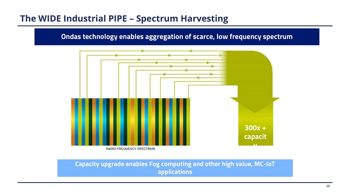300x + c a p a c it y 38 Capacity upgrade enables Fog computing and other high value, MC - IoT applications Ondas technology enables aggregation of scarce, low frequency spectrum The WIDE Industrial PIPE – Spectrum Harvesting