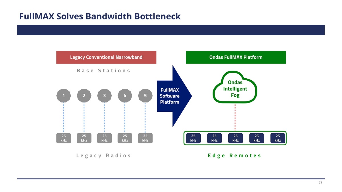 25 k Hz 1 25 k Hz 2 25 k Hz 3 25 k Hz 4 25 k Hz 5 25 k Hz 25 k Hz 25 k Hz 25 k Hz 25 k Hz E d g e R e m o t e s L e g a c y R a d i o s B a s e S t a t i o n s FullMAX Solves Bandwidth Bottleneck Ondas’ Software Enables Intelligence at the Edge Ondas I n t e ll i gen t Fog Legacy Conventional Narrowband Ondas FullMAX Platform FullMAX So f tw a re Platform 39