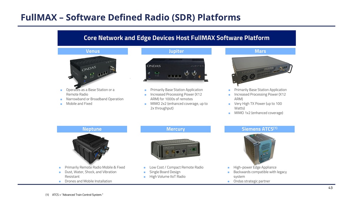 O p e r at e s as a B ase S tati o n o r a R e mo t e R a d i o Narr o w ba n d o r Br o a d b a n d O p era t i o n Mo b i l e a n d F i x ed Primarily Base Station Application I n c r e a s ed P r o c e ss i n g P o we r ( X 12 A R M ) fo r 1000 s o f r e mo t es MI M O 2 x 2 (e n h a n c e d c o ve r a g e , u p t o 2 x thr o ug h p u t ) Primarily Base Station Application I n c r e a s ed P r o c e ss i n g P o we r ( X 12 ARM) Ve r y H i g h T X P ow e r ( u p t o 100 Watts) MI M O 1 x 2 (e n h a n c e d c o ve r a g e) P ri m a ri l y Re m o t e Ra d i o M o bi l e & Fi x e d Dust, W at e r , S h o c k , and V i b r ati o n Resistant Dr o n e s and M o b il e I nsta l l a ti o n L o w C o st / C o mp ac t R e m o te R a d io S i ngl e B o a rd D e s i gn Hi g h V o lume II o T R a d i o Neptune Mercury Siemens ATCS (1) H i gh - p o we r Edg e A p p l i a nc e Backwards compatible with legacy system O n d as str at e g i c p ar tn er Core Network and Edge Devices Host FullMAX Software Platform Venus Jupiter Mars F ullM AX – S o f t w a r e De fine d R a d i o ( S DR ) P l a t f o r ms 43 (1) ATCS = “Advanced Train Control System.”