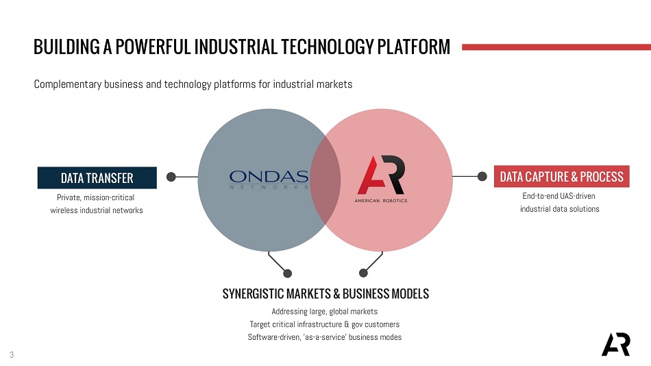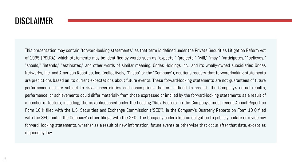 DISCLAIMER 2 This presentation may contain "forward - looking statements" as that term is defined under the Private Securities Litigation Reform Act of 1995 (PSLRA), which statements may be identified by words such as "expects," "projects," "will," "may," "anticipates," "believes," "should," "intends," "estimates," and other words of similar meaning . Ondas Holdings Inc . , and its wholly - owned subsidiaries Ondas Networks, Inc . and American Robotics, Inc . (collectively, "Ondas" or the "Company"), cautions readers that forward - looking statements are predictions based on its current expectations about future events . These forward - looking statements are not guarantees of future performance and are subject to risks, uncertainties and assumptions that are difficult to predict . The Company’s actual results, performance, or achievements could differ materially from those expressed or implied by the forward - looking statements as a result of a number of factors, including, the risks discussed under the heading “Risk Factors” in the Company’s most recent Annual Report on Form 10 - K filed with the U . S . Securities and Exchange Commission (“SEC”), in the Company’s Quarterly Reports on Form 10 - Q filed with the SEC, and in the Company’s other filings with the SEC . The Company undertakes no obligation to publicly update or revise any forward - looking statements, whether as a result of new information, future events or otherwise that occur after that date, except as required by law .