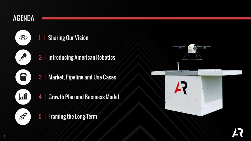 A GEN D A 1 | Sharing Our Vision 2 | Introducing American Robotics 3 | Market, Pipeline and Use Cases 4 | Growth Plan and Business Model 5 | Framing the Long - Term 6