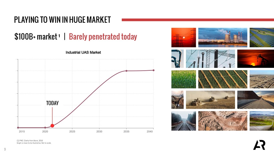 THE OPPORTUNITY Automated drones are the ultimate data gathering solution at the edge Massive market opportunity ($100B+¹) Most technologically advanced platform in the marketplace Industry - leading talent and experience Uniquely secured FAA approvals (required for scale) American Robotics is ideally positioned to drive growth in drone market (1) PWC: Clarity from Above, 2016 8